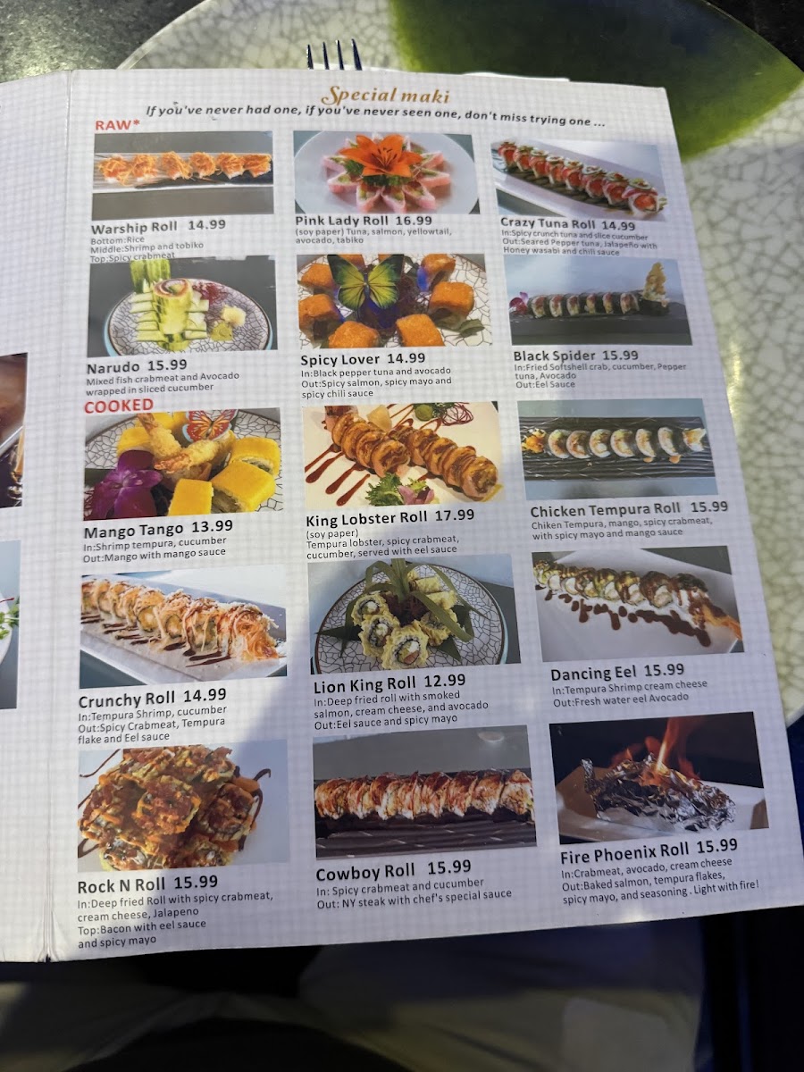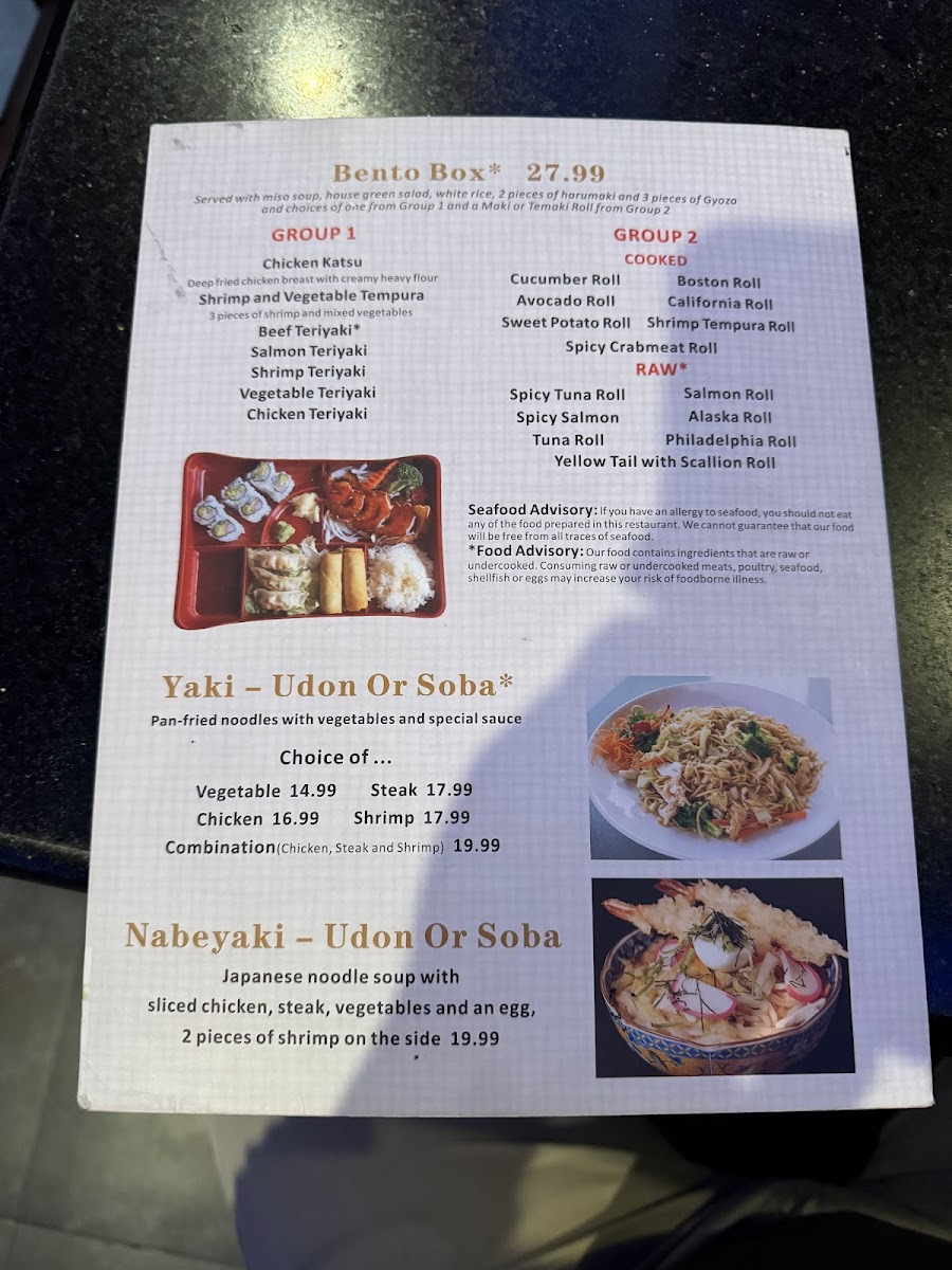 *Our food contains ingredients that are very raw or undercooked. Consuming raw or undercooked meats, poultry, seafood, shellfish or eggs may increase your risk of foodborne illness. If you have an allergy to seafood, you should not eat any of the food prepared in this restaurant. We cannot guarantee that our food will be from all traces of seafood.